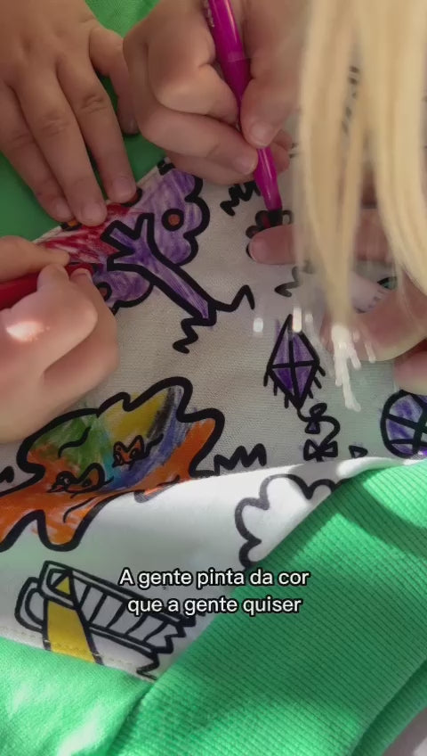 Com bolso canguru para pintar, brincar & lavar! Moletom com modelagem confortável e unissex, produzido com moletinho verde 100% algodão não felpado, tem detalhe de bolso canguru com estampa exclusiva Dia de Brincar - com detalhes já coloridos. Feito no Brasil. GANHE seis (06) canetinhas laváveis e atóxicas, para colorir o..